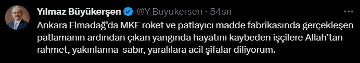 Eskişehir Büyükşehir Belediye Başkanı Prof. Dr. Yılmaz Büyükerşen de, sosyal medya hesabından yaptığı paylaşımla, patlamada hayatını kaybedenlere rahmet ve yaralananlara acil şifalar diledi.
