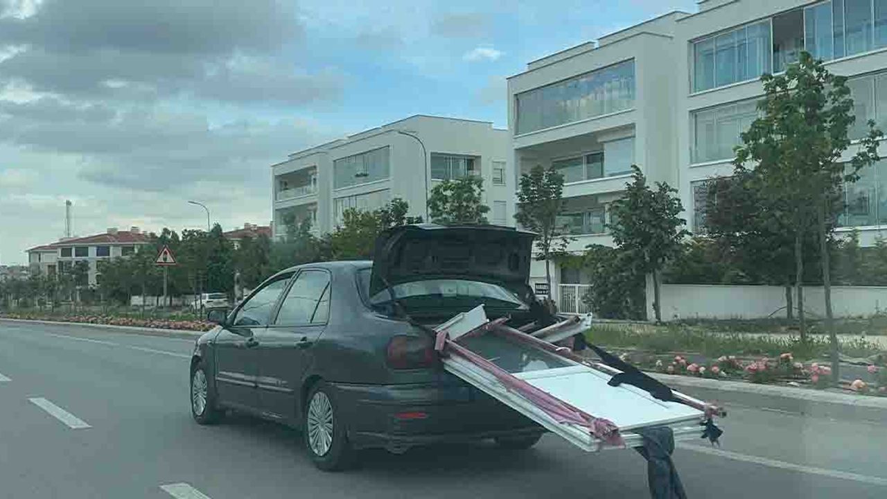 Otomobilin bagajında taşınan kapılar, seyir halindeki diğer sürücüleri tedirgin etti. Kumaş ve bez parçaları ile aracın bagajına bağlanan kapıların tehlike oluşturması sürücülerin akıllarında soru işareti bırakırken, tedirginliğini gizleyemeyen vatandaşlar yolculuklarına başka şeritten devam etti.
