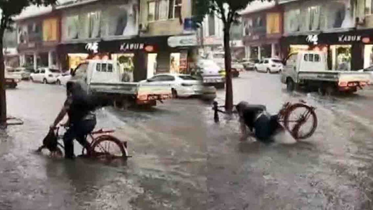 Bisikletiyle yolda ilerlemeye çalışan bir vatandaş ise derinliği kestiremeyince suya battı. O anlar, kameraya saniye saniye yansıdı.