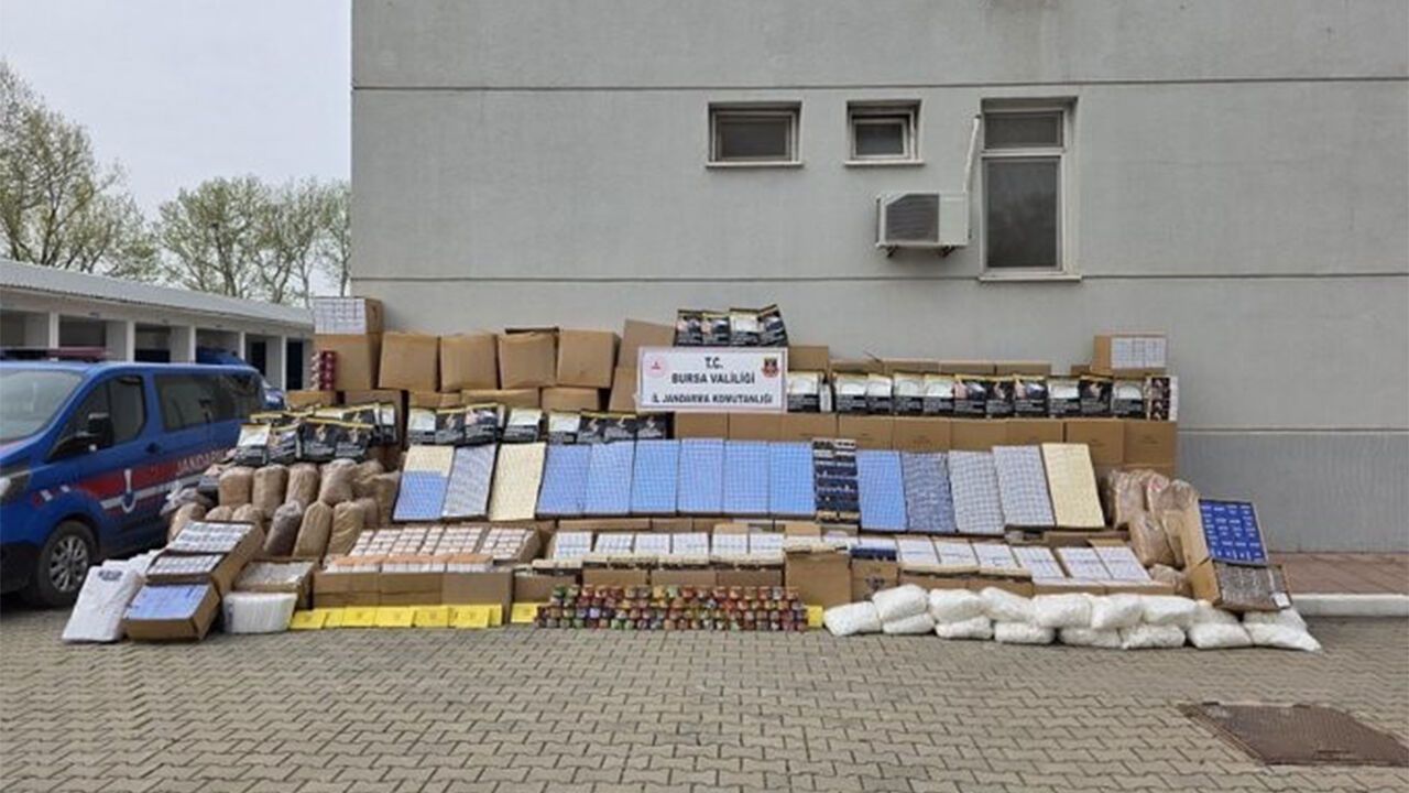 Bursa İl Jandarma Komutanlığı KOM Şube Müdürlüğü ekipleri tarafından kaçakçılıkla mücadele kapsamında yürütülen çalışmalar çerçevesinde, şüphelilere ait iş yeri, depo ve araçlarda arama yapıldı. Yapılan aramalarda 1 milyon 186 bin 600 adet bandrolsüz makaron, 920 kilogram açık sarmalık kıyılmış tütün, 200 bin 800 adet sigara filtresi, 92 bin 620 adet makarona basılmış sigara, 19 bin 800 adet şeffaf naylon sigara poşeti, 18 bin 750 adet boş sigara kutusu, 8 bin 780 paket bandrolsüz sigara, 2 bin 700 paket bandrolsüz sigara kağıdı ile 20 kilogram bandrolsüz nargile tütünü ele geçirildi.