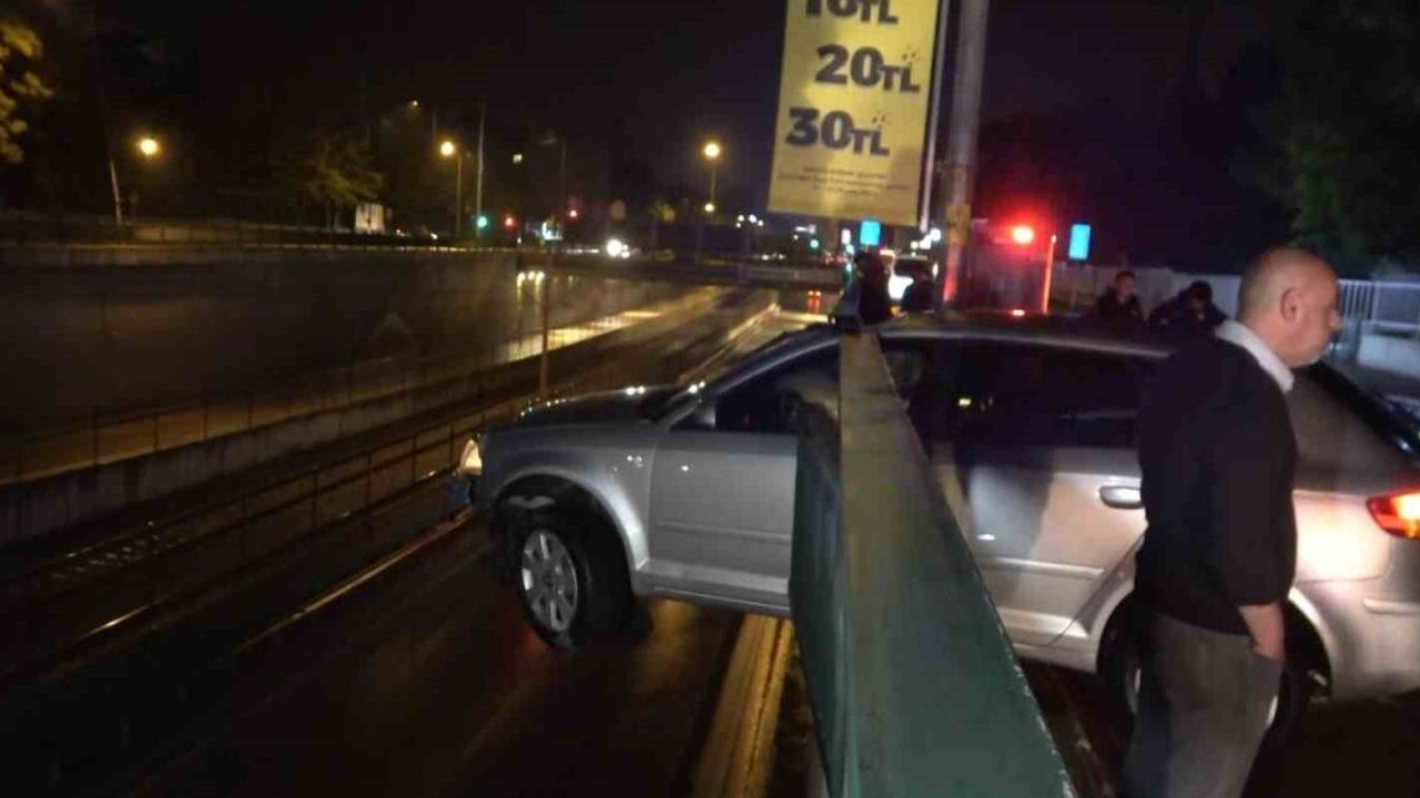 Bursa'da yağış nedeniyle kayganlaşan yolda kontrolden çıkarak bariyerlere saplanan otomobil 5 metrelik alt geçitte asılı kaldı. Sürücü kaza sonrası kendi imkanlarıyla otomobilden çıkarak olay yerinden kaçtı.