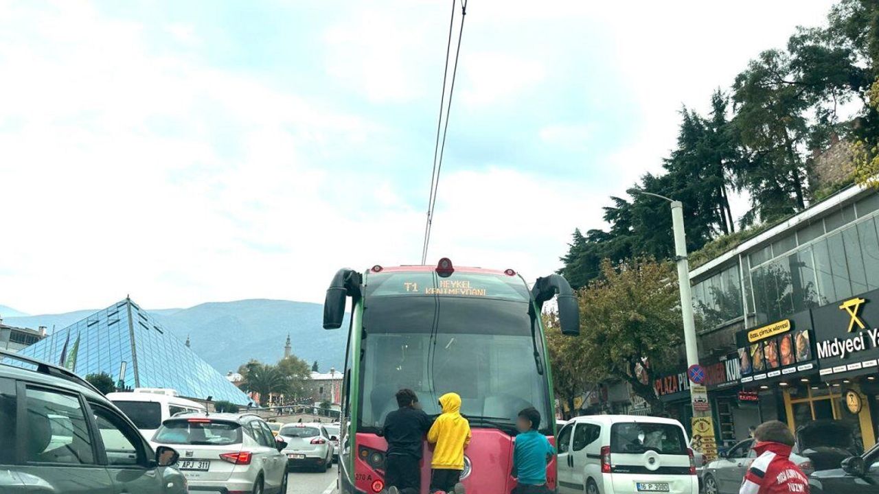 Olay, merkez Osmangazi ilçesinde meydana geldi. Dört çocuk, hareket halindeki bir tramvayın arkasına tutunarak dakikalarca yolculuk yaptı. Trafikte ilerleyen çocukların rahat tavırları pes dedirtirken o anları gören sürücüler büyük şaşkınlık yaşadı. Her an düşüp ağır şekilde yaralanma riski taşıyan çocukların tehlikeli yolculuğu cep telefonu kamerasıyla kaydedildi. Görüntülerde tramvayın arkasına sıkı sıkıya tutunan çocukların uzun süre bu şekilde ilerlediği anlar yer aldı.