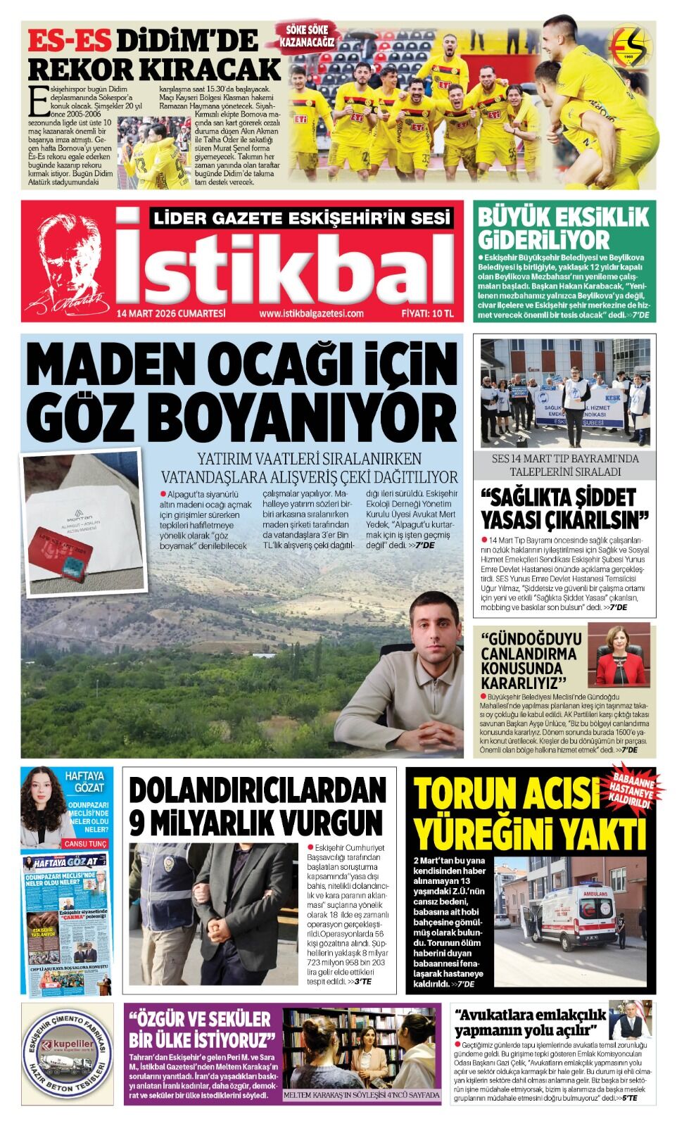 İstikbal Gazetesi 14 Mart 2026 Manşeti