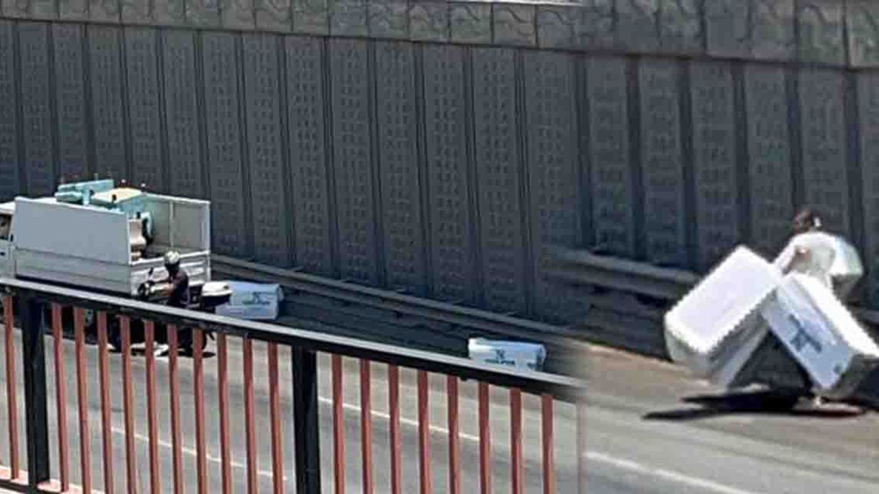 Yolun en sağ kısmına düşen straforları fark eden bir başka kamyonet sürücü ise son anda durdu. Muhtemele bir kazaya davetiye çıkaran sürücü, yüklerini elleriyle taşıyıp tekrar kamyonuna yükledikten sonra yoluna devam etti.