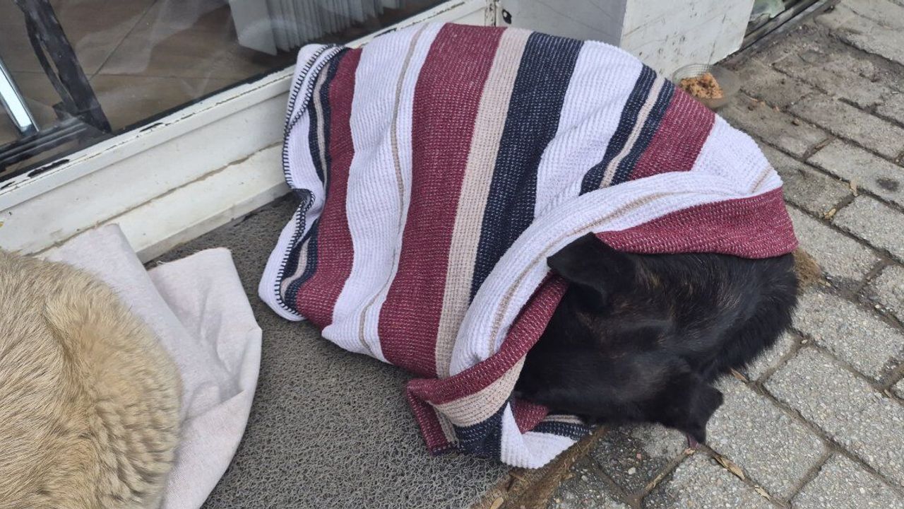 Eskişehir'de duyarlı bir vatandaş, soğuk havaların etkisinde kalan sokak köpeğinin üzerine örterek üşümemesini sağlamaya çalıştı.