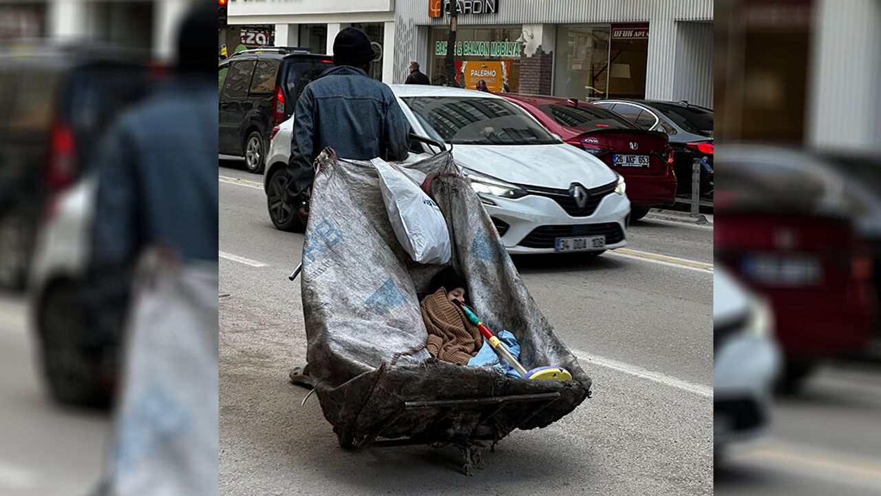Topladığı malzemeleri taşımak için kullandığı el arabasının ön kısmında küçük çocuğunun bulunduğu görüldü. Kalın kıyafetlere sarılı olan çocuk, brandayla çevrili bölümde soğuktan korunmaya çalıştı. Çocuğun ise oyuncak scooterını yanından ayırmadığı görüldü. Kentin en yoğun güzergâhlarından biri olan cadde üzerinde, araç trafiğinin arasında ilerleyen baba ve çocuğu, çevredeki vatandaşların da dikkatini çekti. Soğuk ve karlı havaya rağmen çalışmak zorunda kalan vatandaşın azmi takdir toplarken, çocuğun bu şartlar altındaki görüntüsü ise yürek burktu.