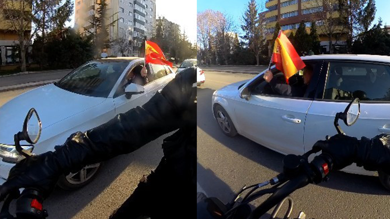 Sosyal platformlarda karşılıklı paylaşımlar sürerken, Eskişehir'de bir sürücü İspanya ve Türk bayrakları ile trafiğe çıktı.