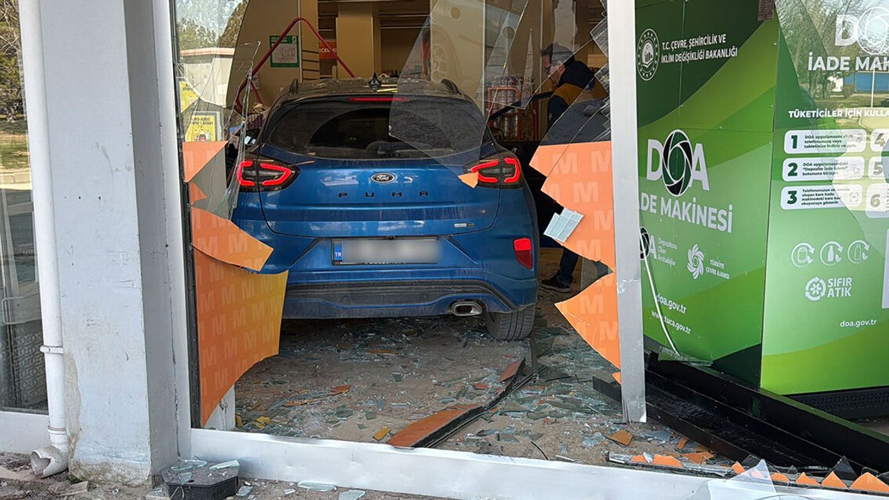 Yol kenarındaki süpermarketin camından içeri giren otomobil, büyük maddi hasara neden oldu.Kazada şans eseri yaralanan olmadı.
