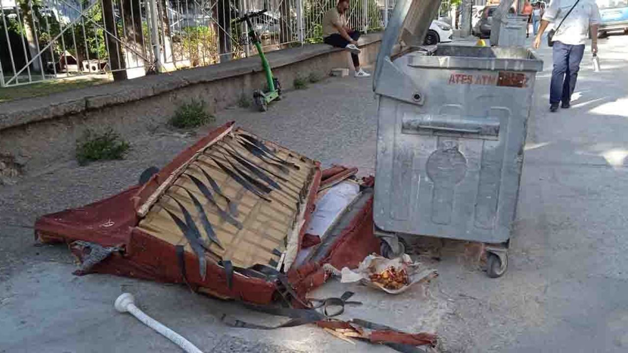 Söz konusu sokakta yer alan bir çöp konteynerinin arkasındaki kaldırıma atılan kanepe parçaları dikkat çekti. Kaldırımın büyük bir bölümünü kaplayarak bulunduğu alanda yaya geçişini zorlaştırdığı görülen kanepe parçalarının atılış şekli hayret ettirdi. Sokaktan geçen bazı vatandaşlar ise kötü görüntü oluşturan manzara karşısında “Hala çöp atmasını bilmeyen vatandaşlar var. İnsanların artık duyarlı olması gerekiyor. Bu görüntüleri görmek istemiyoruz. Çevreyi korumalıyız” yorumlarında bulundular. Kentte geçtiğimiz günlerde de farklı sokaklardaki çöp konteynerlerinin çevresinde benzer görüntülere rastlanılmıştı.
