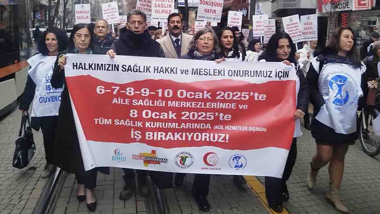 Eskişehir’de sağlık çalışanları, 5 gün süren iş bırakma eylemlerinin son gününde yürüyüş düzenledi. Yürüyüş, Eskişehir İl Sağlık Müdürlüğü önünde yapılan basın açıklamasıyla sona erdi. Eyleme Cumhuriyet Halk Partisi (CHP) Eskişehir Milletvekili Jale Nur Süllü, CHP Eskişehir İl Başkanı Talat Yalaz ve çok sayıda sağlık çalışanı destek verdi.