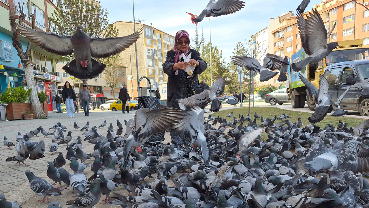 Tepebaşı İlçesi'nde yaşayan 65 yaşındaki Naide Toy, pazara gittiğinde çevredeki güvercinler için de yem alıyor. Sıhhiye Kavşağı'nda bulunan birçok kuşu besleyen Toy, geçtiğimiz gün yem verirken onlarca güvercinin arasında kaldı.