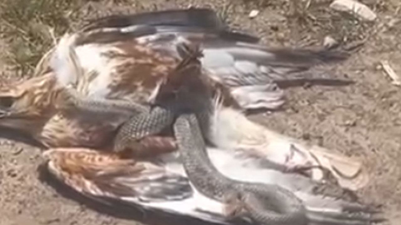 Kartalın uçmaya çalışmasına da müsaade etmeyen yılan, talihsiz yırtıcı kuşu tüm çırpınışlarına rağmen serbest bırakmadı.