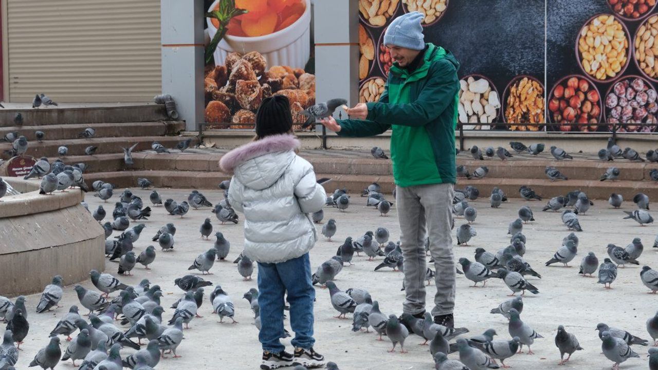 Yerlere yem atmak yerine avucunun içine ekmek koyarak güvercinleri elinde besleyen vatandaş, yoldan geçenlerin dikkatini çekti.
