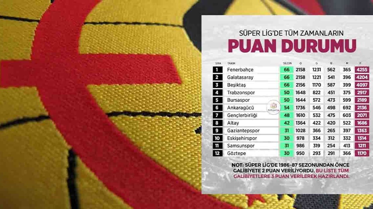 Paylaşılan tabloya göre Fenerbahçe 4 bin 255 puan ile ilk sırada yer alırken, 4 bin 204 puan toplayan Galatasaray 2'nci, 4 bin 97 puan toplayan Beşiktaş Jimnastik Kulübü 3'üncü ve 2 bin 917 puan toplayan Trabzonspor 4'üncü sırada yer aldı.