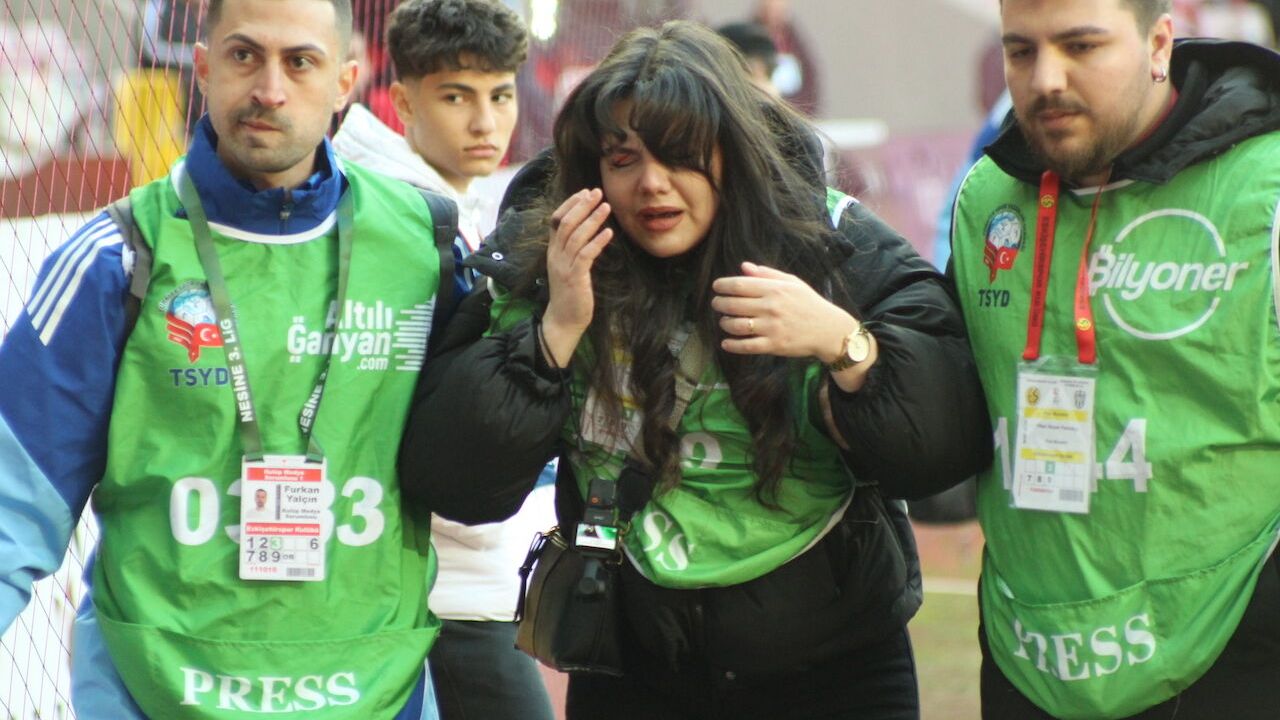 Topun başına isabet etmesiyle birlikte Pamukçu’nun göz kapağının üzerinde kanama meydana geldi. Sağlık ekipleri hızlı şekilde müdahale ederken, genç muhabir saha içinde bekleyen ambulansa alınarak tedavi edildi.