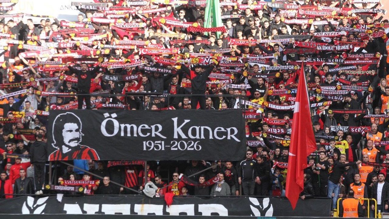 Hafta içi vefat eden eski gol kralı için Eskişehirspor taraftarı, Ayvalıkgücü Belediyespor maçında Ömer Kaner’in fotoğraflı dev pankartını asarak efsanesini unutmadı.