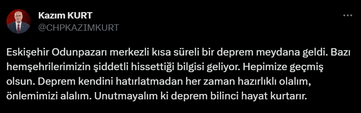"Eskişehir Odunpazarı merkezli kısa süreli bir deprem meydana geldi. Bazı hemşehrilerimizin şiddetli hissettiği bilgisi geliyor. Hepimize geçmiş olsun. Deprem kendini hatırlatmadan her zaman hazırlıklı olalım, önlemimizi alalım. Unutmayalım ki deprem bilinci hayat kurtarır."
