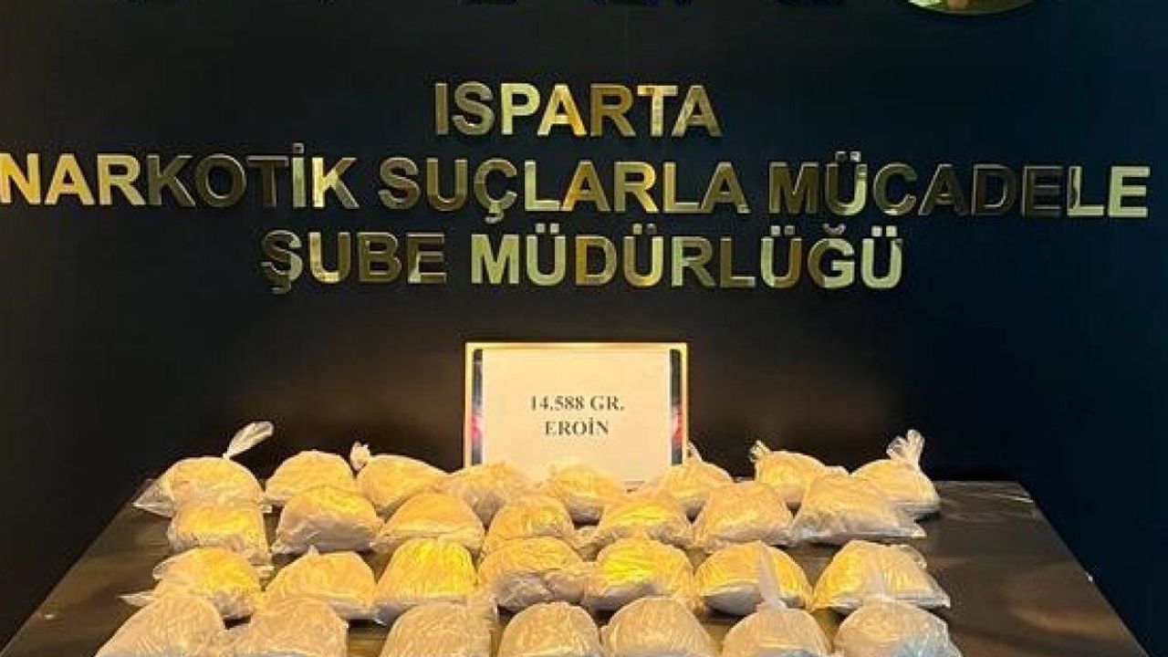 Isparta Emniyet Müdürlüğü Narkotik Suçlarla Mücadele Şube Müdürlüğü ekipleri tarafından Isparta genelinde uyuşturucu madde nakli ve sevkiyatına yönelik operasyon düzenlendi. Operasyonda bir araçta 2 şüpheli şahıs yakalandı. Yapılan aramada; 14 kilo 588 gram eroin ve suçtan elde edilen 47 bin 120 TL ve 710 euro nakit para ele geçirildi. Yakalanan 2 şüpheli şahıs hakkında "Uyuşturucu veya Uyarıcı Madde Ticareti Yapmak" suçundan işlem yapılarak, şüpheli şahıslar çıkarıldığı mahkemece tutuklanarak cezaevine gönderildi.