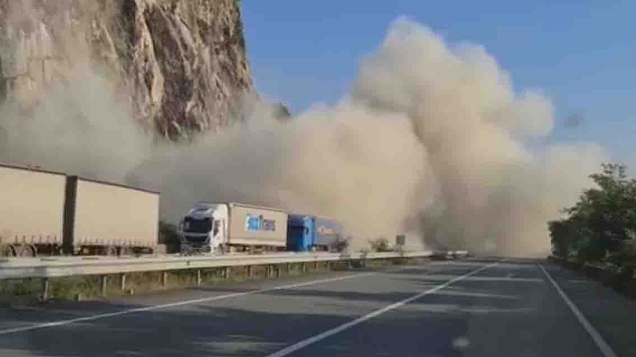 Öte yandan heyelan anı ise araç kamerasına yansıdı. Görüntülerde heyelan nedeniyle etrafı toz bulutu kapladı.