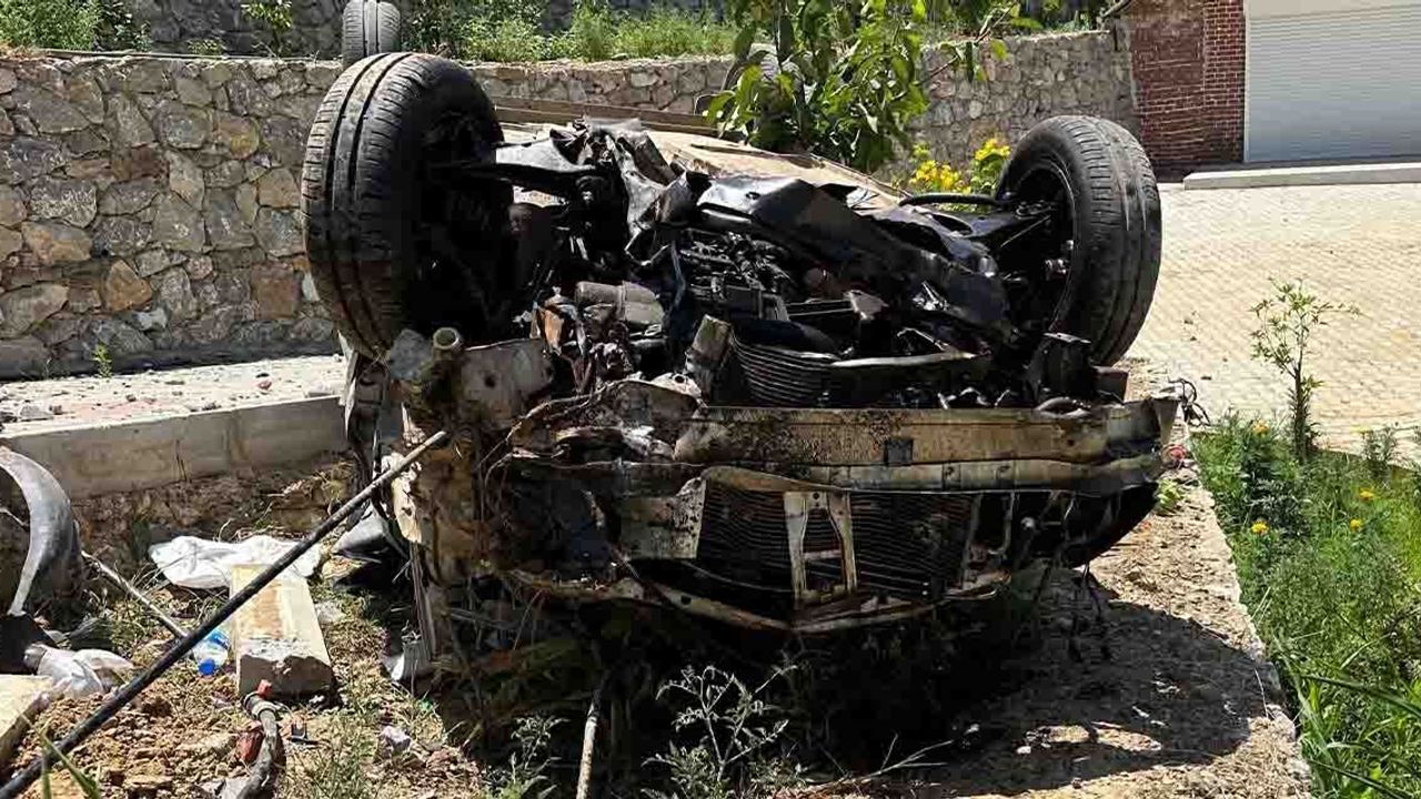 Köpeğe çarpmamak için direksiyonu kıran sürücü, aracın kontrolünü kaybetti. Savrulan otomobil, yaklaşık 10 metre yükseklikteki istinat duvarını aşıp bir evin bahçesine uçtu.