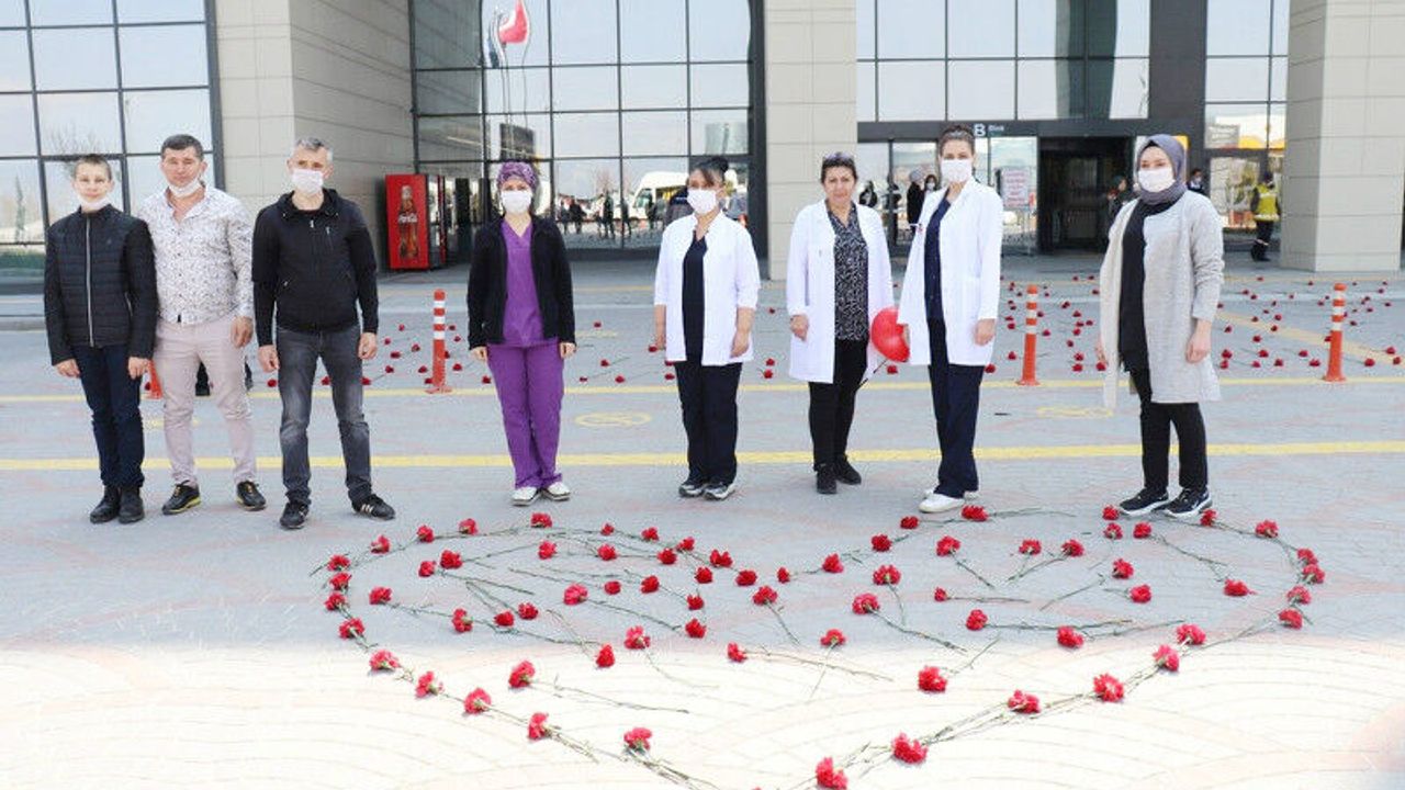 Türkiye genelinde Korona virüse karşı önlem ve mücadele sürerken, bu mücadelenin başında yer alan sağlık çalışanlarına destekler devam ediyor. Eskişehir'de bir çiçek firması tarafından sağlık çalışanlarına teşekkür ve destek amacıyla Eskişehir Şehir Hastanesi önüne onlarca karanfil bırakıldı. Hastane önünde hazırlanan kırmızı karanfillerden kalp oluşturularak, sağlık nefeslerinin yalnız olmadığı vurgulandı.