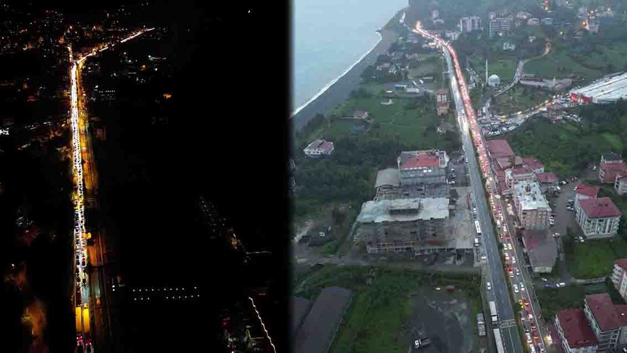 Sarp Sınır Kapısı'nı gün gece yarısı itibariyle 40 bin 960 yolcu kullanırken, 2 bin 410 adet araç giriş ve çıkış yaptı. Sınır kapısındaki yoğunluk bölgede trafiği de olumsuz etkilerken, tır kuyruğunu görmeye alışık olduğumuz bölgede Sarp Sınır Kapısı'ndan Hopa ilçesine 20 kilometrelik araç kuyruğu oluştu. Araç kuyruğu havadan görüntülendi.